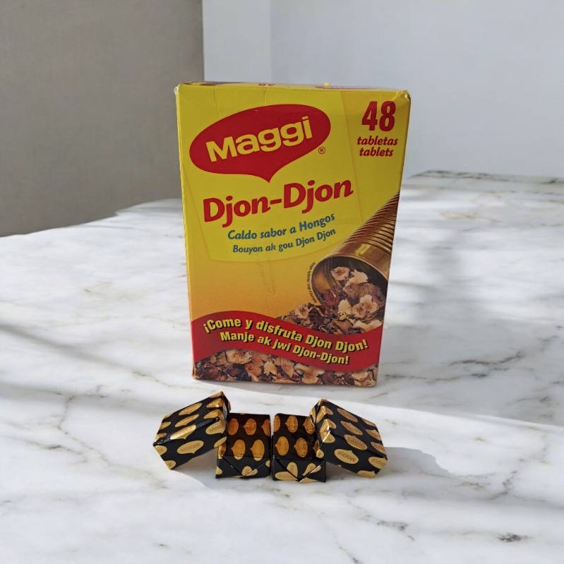 Cubes de bouillon MAGGI Djon Djon – aromatisé aux champignons Utilisez pour cuire du riz aromatisé aux champignons (du riz djondjon) style cuisine des Caraïbes Cuisine haïtienne.